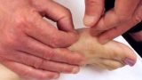 膝を60度ぐらい曲げ、太い筋と骨との間に取る。そこが膝窩横紋頭で太い筋の前縁に当たる。